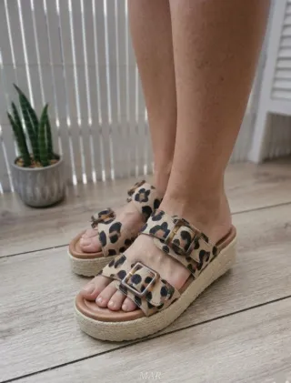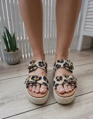 Sandalias de plataforma con estampado de leopardo. - Diseño con dos tiras y hebillas. - Plataforma forrada de esparto. - Suela de goma.