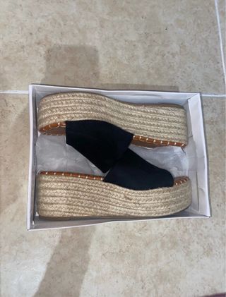 Sandalias negras con suela de esparto. Sin estrenar. - Diseño de tiras cruzadas. - Tira trasera ajustable con hebilla. - Plataforma con acabado de esparto.
