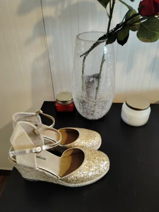 Sandalias de tiras cruzadas con mucho brillo. - Diseño con purpurina multicolor. - Tira trasera elástica dorada. - Suela de esparto. son talla 40 pero tallan muy Justo. Yo uso de normal el 39 y me están bien Nunca usadas. Se entregan sin la caja original