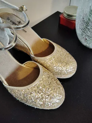 Elegantes sandalias con cuña y detalles brillantes. - Acabado en purpurina dorada. - Tira ajustable al tobillo con hebilla. - Diseño de cuña con acabado de esparto.