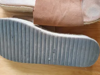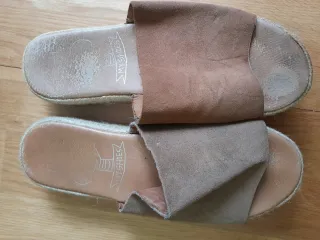 Sandalias planas de color marrón, ideales para el verano. Son de ante y tienen una plataforma de esparto. Están en muy buen estado. - Material: ante - Tipo: planas - Suela: esparto - Número de artículos: 2