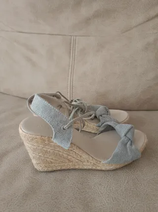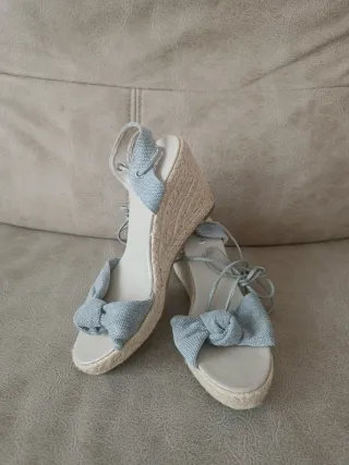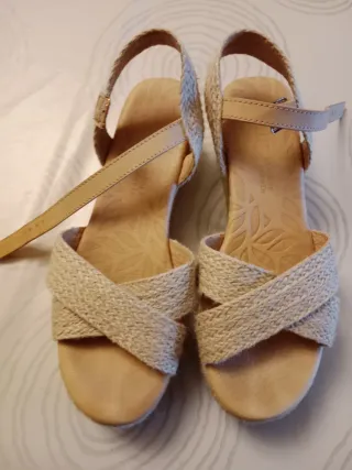 Preciosas sandalias de cuña en color beige. Ideales para verano. Como nuevas. Muy cómodas , tejido muy suave. - Tienen una plataforma de esparto. - El cierre es con hebilla en el tobillo. - Son talla 38.
