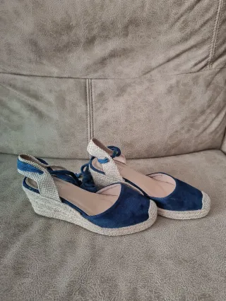 Preciosas sandalias de plataforma en azul marino, talla 39. Ideales para verano. - Material: ante. - Suela de esparto. - Cierre de hebilla en el tobillo. - Perfecto estado.