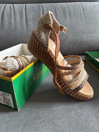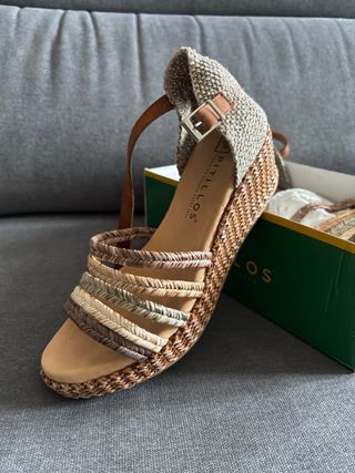 Sandalias de cuña con tiras de esparto y detalle marron. - Tira frontal cruzada. - Tira de tobillo ajustables con velcro - Plataforma 7 cm forrada de esparto - Planta soft line - Solo se ha usado una hora