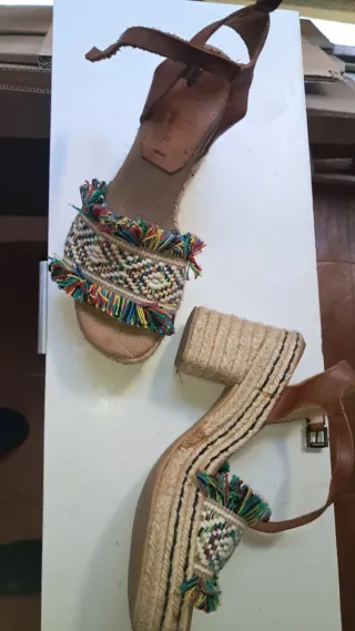 Sandalias de esparto con tiras trenzadas en tonos oro y plata. Puestas para una boda solo. La suela parece que está algo mal porque es como de espuma y se chafa fácil. El resto está genial. La plantilla es muy cómoda y blandita. Talla 39 con poco tacón de esparto.