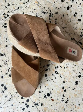 Sandalias tipo ante con un diseño cruzado y plataforma con acabado de esparto. En muy buen estado