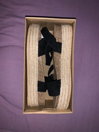 Sandalias de cuña de la marca Stradivarius. Son de color negro y están en buen estado. - Material: esparto y piel sintética. - Altura del tacón: media. - Cierre: hebilla en el tobillo. - Ideales para verano. - Las he llevado bastante porque quedan muy bien. Pero están en perfecto uso.