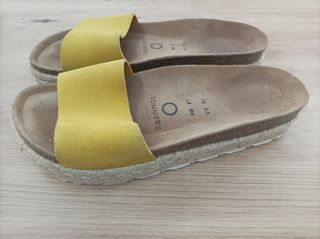 Sandalias plataforma de Bershka en color mostaza. Ideales para verano. - Son de ante sintetico - Tienen plataforma de esparto. - Cierre con hebilla. -Muy poco uso