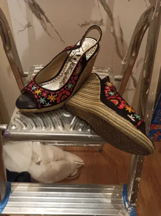 Preciosas sandalias de esparto, ideales para el verano. Son de cuña y están decoradas con flores de colores. - Perfectas para un look fresco y veraniego. - Se encuentran en buen estado. - El par incluye dos sandalias. No envíos.