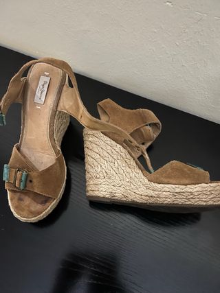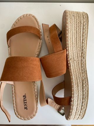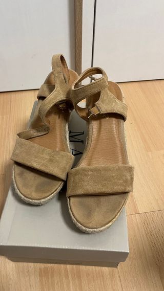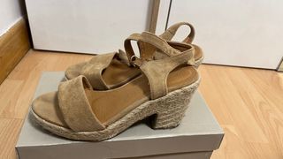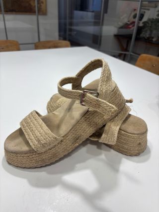 Sandalias de esparto, poco uso por causas de roces, se entregan con la caja, 3 dedos de plataforma, cómodas, precio no negociable.
