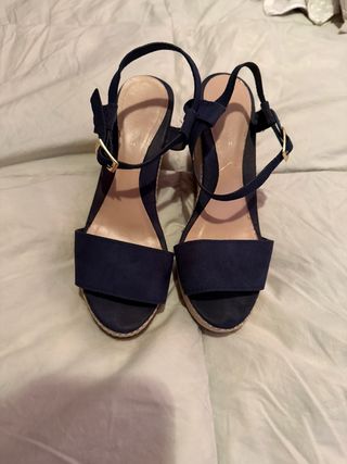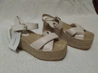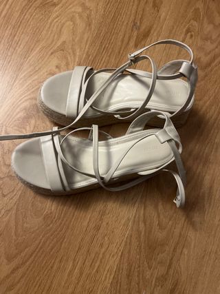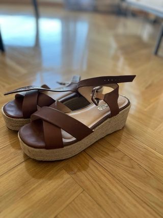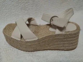 Sandalias de cuña con tiras. - Diseño de cuña con acabado de esparto. - Tiras finas en la parte delantera. - Cierre de pulsera al tobillo con hebilla dorada. las vendo porque nos las utilizo
