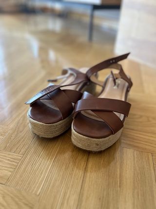 Sandalias de cuña con detalle de esparto. - Tira ajustable al tobillo. - Diseño cruzado. - Talla 37, tienen una pequeña parte del esparto un poco fuera, sale en la última foto.