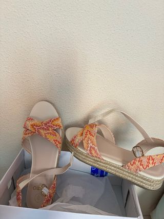 Sandalias de cuña con un diseño cruzado en la pala, adornadas con un estampado vibrante. - Pala con diseño cruzado y estampado. - Cierre de tira con hebilla. - Cuña con acabado de esparto. muy coloridas , nuevas con etiqueta y caja pero un poco estropeada la caja como se muestra en la foto.