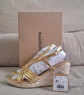 Elegantes sandalias de cuña con un diseño abierto y tiras entrelazadas. Perfectas para añadir un toque de estilo a cualquier atuendo. - Material exterior de ante. - Forro interior dorado brillante. - Suela de esparto. - Cierre de pulsera al tobillo. Negociable