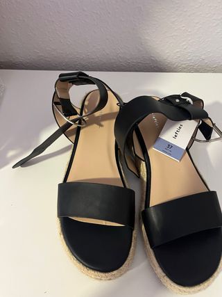 sandalias Graceland en talla 36, muy cómodas y de estilo casual, perfectas para verano o para el día a día. ✨ Características: Color: beige, negro y detalles en marrón Tiras anchas de tela resistente Detalle decorativo con tiras marrones y piezas metálicas Planta acolchada, cómoda para caminar Suela con acabado tipo esparto y diseño trenzado en negro y beige En buen estado general, puesta un par de veces y bien cuidadas Perfectas para combinar con vestidos, shorts, jeans o ropa casual.
