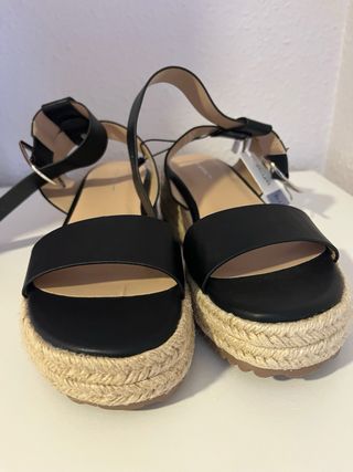 Solo usada un rato para una boda, pero eran muy altas para lo que suelo usar y ya no se ha usado mas.Sandalias de cuña altas con un diseño moderno y cómodo. - Material exterior de ante. - Correa ajustable al tobillo. - Plataforma y cuña forradas de esparto.