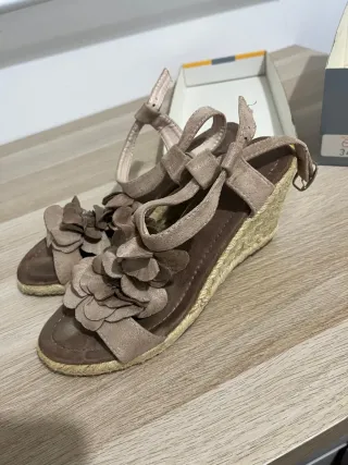 Sandalias de ante en tonos beige, con plataforma de esparto, talla 39-40. Nunca se han usado - Material exterior: ante. - Plataforma: esparto. - Cierre con tira al tobillo, en perfecto estado.