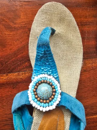 Sandalias tuneadas con un diseño único y llamativo. Núm 39, son estrechas serán un 37/38 - Tira delantera con abalorios y piedras decorativas. - Tira trasera ajustable con hebilla metálica. - Suela con acabado esparto.