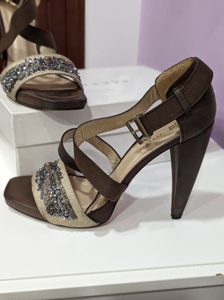 Preciosas sandalias de tacón de la marca FARRUTX. Son de color beige y marrón, con detalles en dorado. Están fabricadas en piel y tienen un diseño elegante y sofisticado. - Diseño de tiras con cierre de cordones. - Tacón muy comodo - Decoradas con adornos brillantes. Usadas en 2 ocasiones
