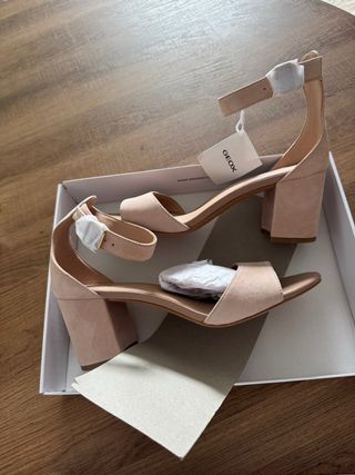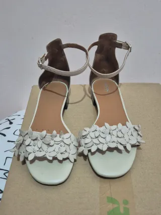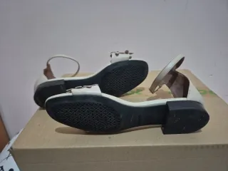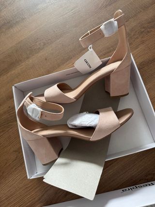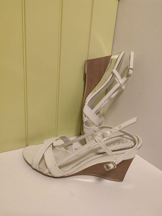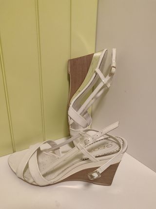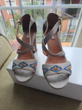 Elegantes sandalias de Geox con un diseño moderno y cómodo. - Material exterior de cuero blanco. - Tacón de madera con acabado natural. - Cierre de correa ajustable al tobillo. - Diseño abierto con tiras cruzadas. SOLO HAGO ENVIOS Sandalias de tacón de unos 8-9cm de alto que vendo porque me resulta muy alto el tacón. Me gustaban mucho porque me estilizaban la pierna y me sentía muy cómoda con ellas. Como se ve en las fotos, la parte de atrás de dentro de la sandalia tiene algun desperfecto porque le puse un potector para que no me hiciese daño. La correa es ajustable al tobillo porque tiene hebilla y la suela es transpirable.