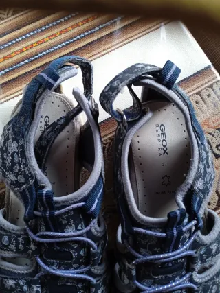 Sandalias Geox en talla 30, perfectas para los días de verano. Combinan comodidad y estilo. - Cierre de velcro ajustable. - Suela flexible y transpirable. - Diseño moderno en tonos azul y beige.