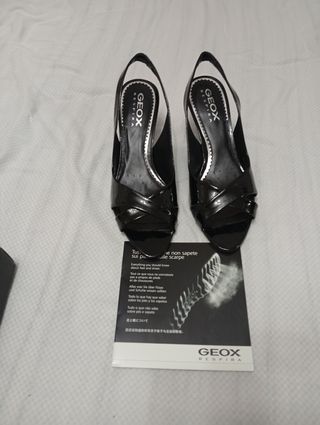 Elegantes zapatos de tacón Geox en color negro. - Diseño abierto con tiras cruzadas. - Tacón de altura media. - Detalle de logo en la plantilla. Utilizado solo para 1 evento. Muy cuidados.
