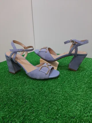 Elegantes sandalias de tacón Geox en un bonito tono azul con detalles dorados. - Pequeño pelado en la punta. - Diseño abierto. - Correa ajustable al tobillo. - Tacón grueso y cómodo. - Adorno metálico en la pala.