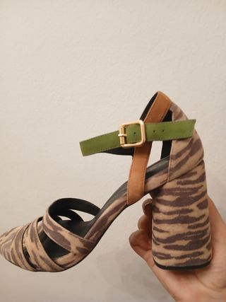 Elegantes sandalias con tacón y estampado animal print. - Diseño con tiras cruzadas en la parte delantera. - Correa ajustable al tobillo con hebilla dorada. - Detalle en ante en el talón y la correa.