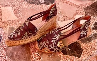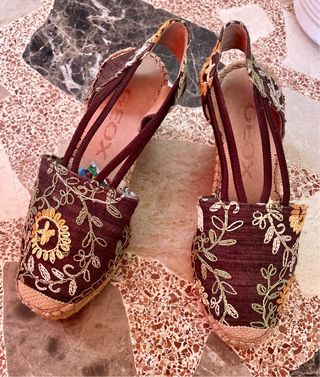 Preciosas sandalias de cuña de la marca Geox, talla 35. Marrones con bordados multicolor. Ideales para el verano. Puestas 2 veces. - Diseño elegante y cómodo. - Perfectas para cualquier ocasión. 2 cms. plataforma, 7 cms. tacón