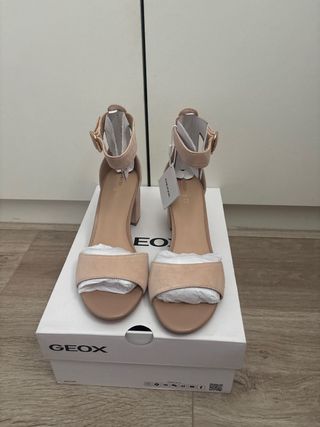 Sandalias de tacón de la marca Geox, en color beige. Son de ante y tienen un diseño elegante y sencillo. Ideales para cualquier ocasión. - Tacón cómodo y estable. - Hebilla de cierre ajustable. - Perfectas para primavera/verano. - Se venden en su caja original.