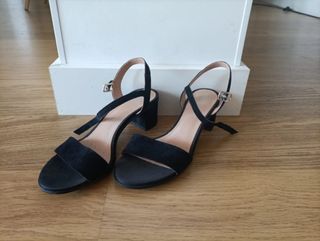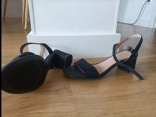 Sandalias Geox de color negro, ideales para cualquier ocasión. Son de ante y tienen un tacón bajo cómodo. Solo las he usado una vez un par de horas. - Tacón bloque. - Hebilla de cierre. - Perfectas para el verano.