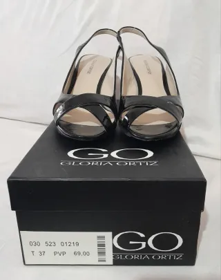 Sandalias de charol negro Gloria Ortiz, totalmente nuevas y sin usar. Modelo elegante con tiras cruzadas y punta cuadrada, perfectas para eventos o vestir. Muy cómodas y de gran calidad. Nuevas a estrenar en su caja original
