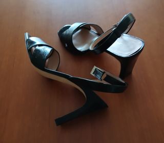 Sandalias de piel negras. Elegante diseño. Cierre con hebilla ajustable. Número: 39 Tacón: 10 cm PRECIO: 50€
