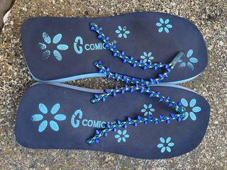 Sandalias hawaianas usadas, en buen estado. - 1 par de sandalias. - Diseño con flores. - Adornadas con cuentas azules y doradas.