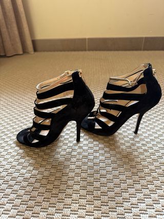 Sandalias de tacón alto, color negro. Son preciosas y elegantes. - Material: ante. - Tacón fino. - Diseño de tiras. - Cierre de cremallera en el tobillo. - Perfecto estado.
