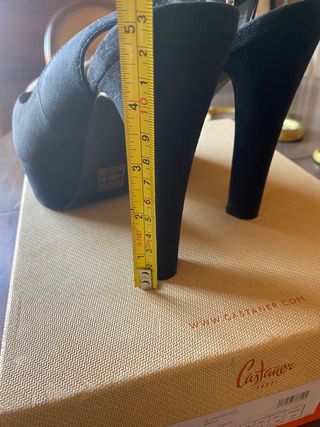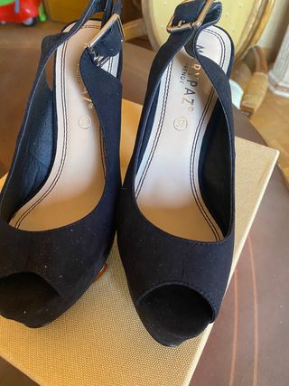 Sandalias negras en piel vuelta del número 38, puestas en dos ocasiones, tiene plataforma de 2 cms. y el tacón mide 10 cms