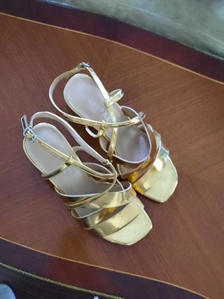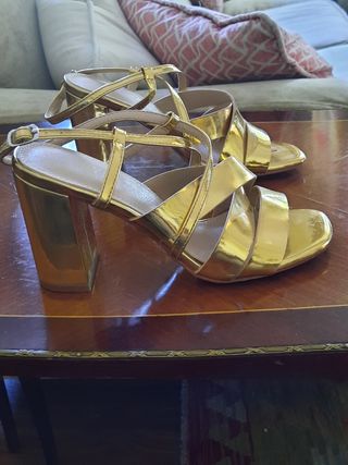 Sandalias doradas metalizadas. Impecables. Talla 36. Tacón bloque. Puestas una noche en un evento. Vendo por no poder llevar tacón tan alto. Altura del tacón 9 cm por detrás y 6 cm por el interior.