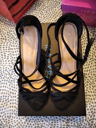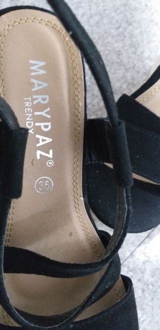 Sandalias negras de tiras de tacón. Talla 36. De Mary Paz. buen estado Se entregan en su caja original. Se pueden ver y probar sin compromiso. Zona de Pueblo Nuevo.