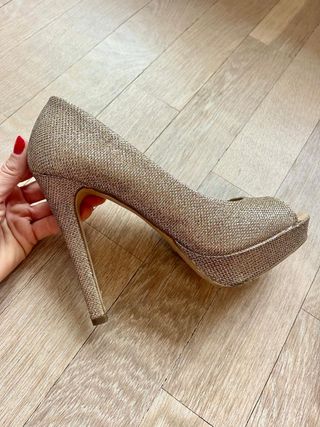 Elegantes sandalias de tacón con un toque brillante. Perfectas para ocasiones especiales. - Diseño peep-toe. - Tacón alto y plataforma. - Acabado con purpurina.