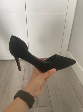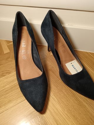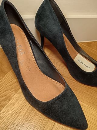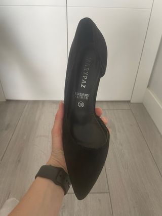 Preciosos tacones de salón negros de la marca Mary Paz, talla 38. Son de ante, con un diseño elegante y sofisticado. -Punta fina. -Tacón fino. -Corte en el empeine.