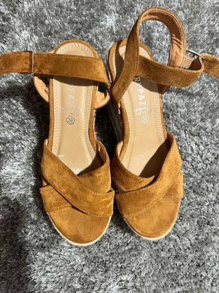 Sandalias de cuña de la marca MARY PAZ. Son de color marrón y de la talla 38. Están en buen estado. - Material ante. - Diseño de tiras cruzadas. - Suela de esparto.