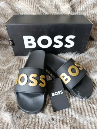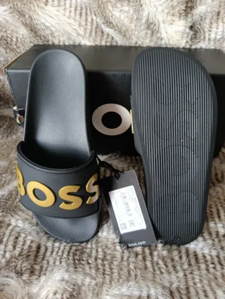 Chanclas de la marca Boss con un diseño elegante y moderno. - Banda superior con logo Boss en relieve dorado. - Suela negra. - Incluye caja original y etiqueta con código de web. Originales 💯 - Precio en web Boss 80€. - Talla 37