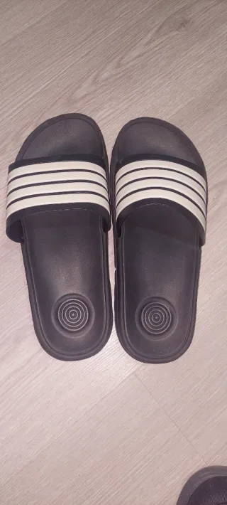 Chancletas cómodas y versátiles, perfectas para la piscina o para estar en casa. - Diseño con tres bandas blancas. - Suela con patrón circular.