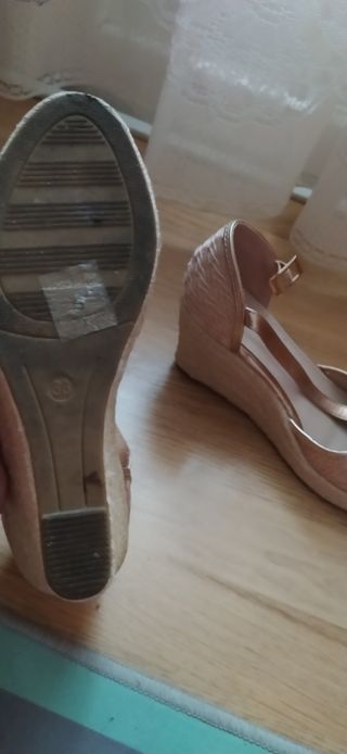 sandalias doradas, se atan con lazo son muy bonitas y cómodas. son un 38 pero calzan 39