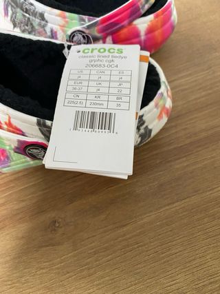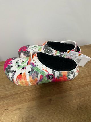 Crocs con forro interior para mayor comodidad y calidez. Diseño vibrante y único. - Talla L. - Estampado tie-dye. - Forro interior de pelo sintético.