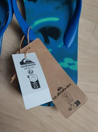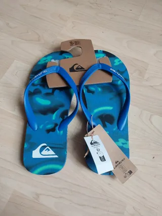 Chanclas de la marca Quiksilver con un diseño llamativo. - Tira azul con logo blanco. - Suela con estampado camuflaje azul y verde. - Talla 43.