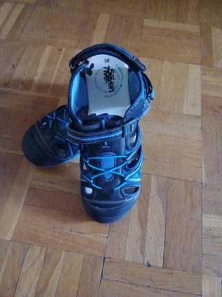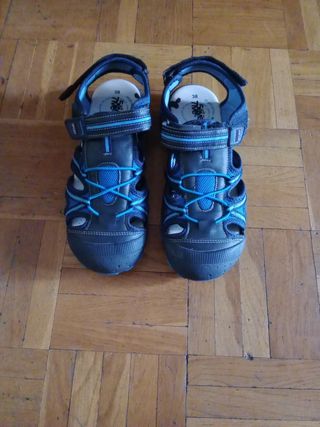Sandalias de hombre de color azul con negro. Llevan velcro atrás y arriba del tobillo. Talla 38. Solo una vez usada.