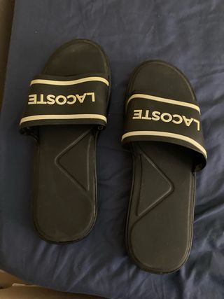 Vendo un par de chanclas Lacoste verdaderas. Son de color negro y estan en buen estado, aunque presentan un ligero desgaste por el uso. - Diseño clásico de Lacoste. - Cómodas y ligeras. - Perfectas para el verano.
