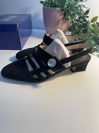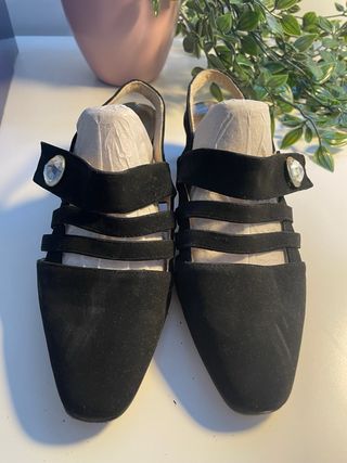 Sandalias tacon,zapato clasico destalonado en color negro, perfectas para ocasiones elegantes o estilo casual chic.Estilo/corte: Sandalias de dedo con tacón de medio tacón (kitten heel), tiras de tobillo y diseño peep-toe.Detalles: Suela estampada con motivos de mariposas, correa ajustable en tobillo.Material: Ante (suède) de alta calidad.Talla: 38 Medidas aprox.: Tacón 7 cm, ancho suela 8 cm.Estado: Muy buen estado, usado pocas veces, sin manchas ni rotos. #zapatosmujer #taconesnegros #sandaliasnoche #nicolecalzado #anteelegante #womenheels #blackshoes #suedesandals #nicolesho