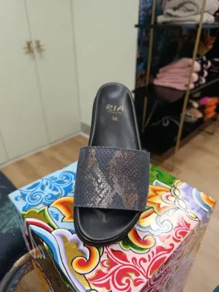 Chancletas de piel con un diseño moderno y elegante. - Tallas disponibles:,38,42. - Banda superior con acabado en piel de serpiente. - Detalle en dorado que aporta un toque de brillo. - Suela cómoda para el día a día. no sé admiten devoluciones.